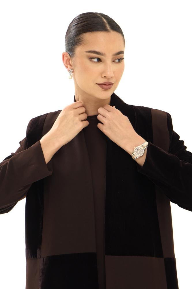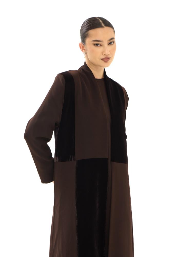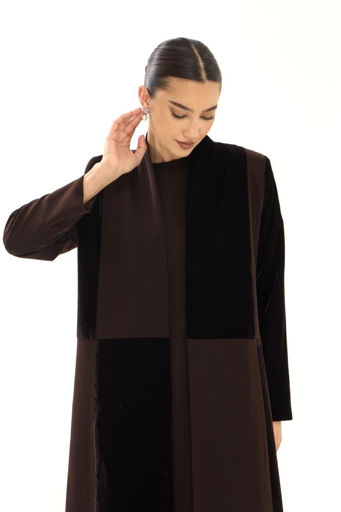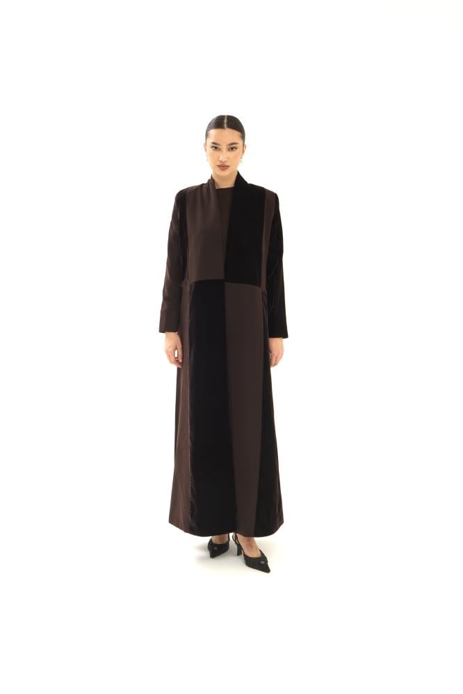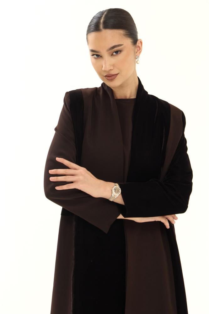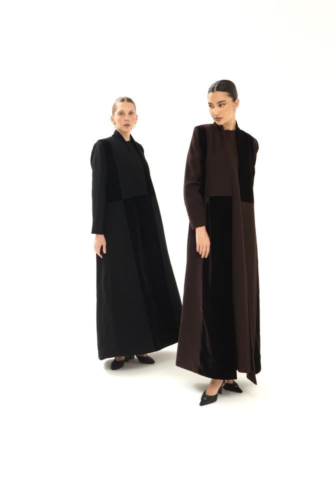 A luxury winter abaya crafted from Japanese velvet and crepe in an elegant A-line cut, enhanced with subtle shoulder pads for added structure and fully lined for refined comfort.